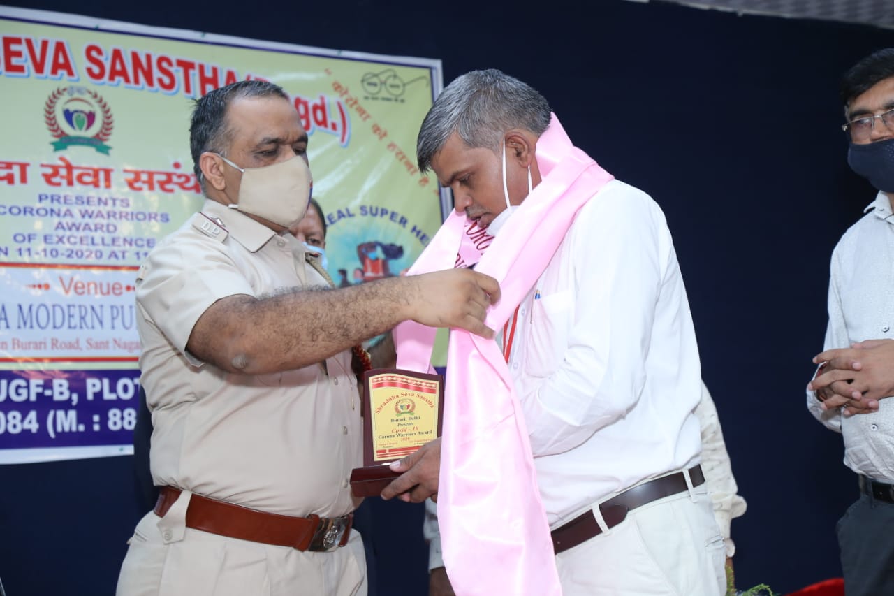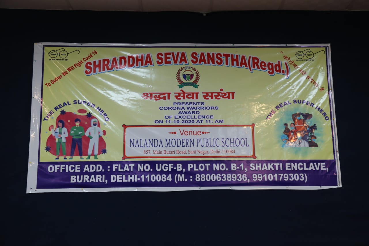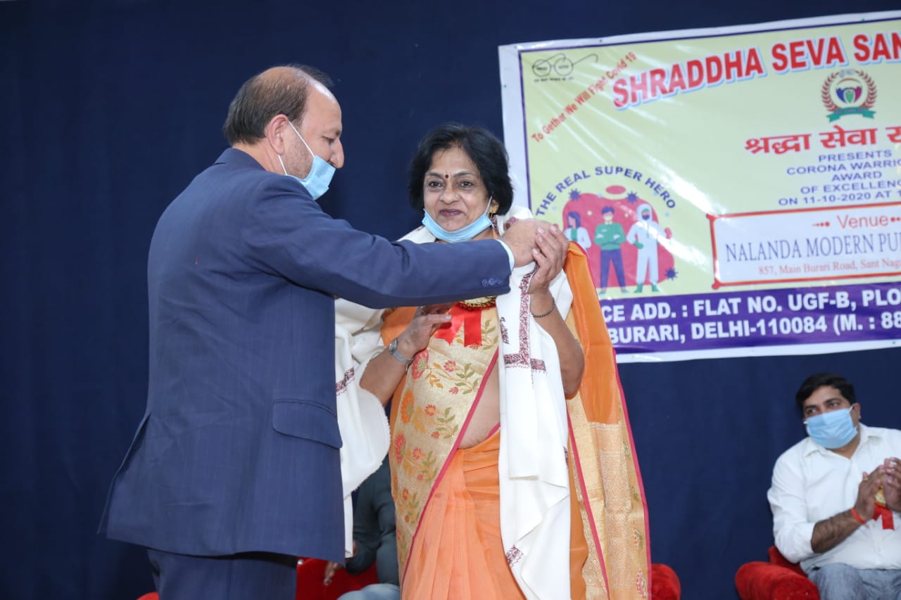 On dated 11th October 2020 (Sunday), In the auditorium of Nalanda Model Public School, Sant Nagar (Burari) 50 Corona Warriors were honoured by SHO Burari Sh. Suresh Kumar, Dr. Abdul Rehman Khadim Principal Green Valley College of Education, Sri Nagar (J&K) and Sh. Vikas Vats from the Parental School. Founder of Shraddha, Smt. Veena Chopra and Chairman Sh. Satya Prakash Bhardwaj Presided the function and welcome the Chief Guest. On this occasion Miss Komal Joshi, Sh. Rajveer Yadav, Sh. Rajeet Singh and Volunteers were present. On this auspicious occasion Sh. Suresh Kumar gave his blessings to Corona Warriors who are at the front-line of COVID-19 response. Together we will fight COVID-19 “As we contribute in our own way through social distancing and observing personal hygiene, let us salute our Corona Warriors” said by Dr. Abdul Rehman Khadim. Founder of Shraddha Smt. Veena Chopra gave vote of thanks. All Corona Warriors were honoured by angavastram, Shield, Medal along with some refreshment.