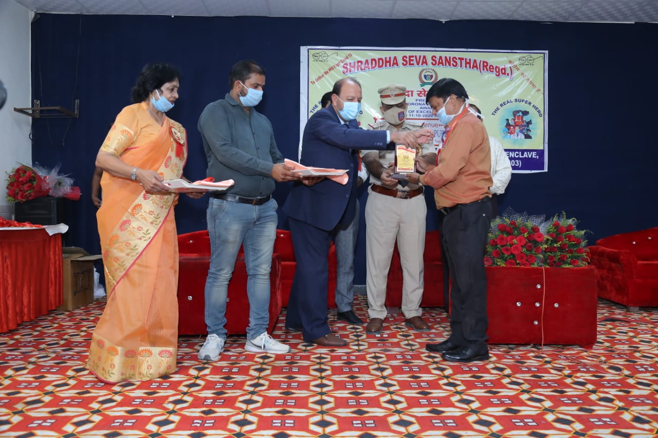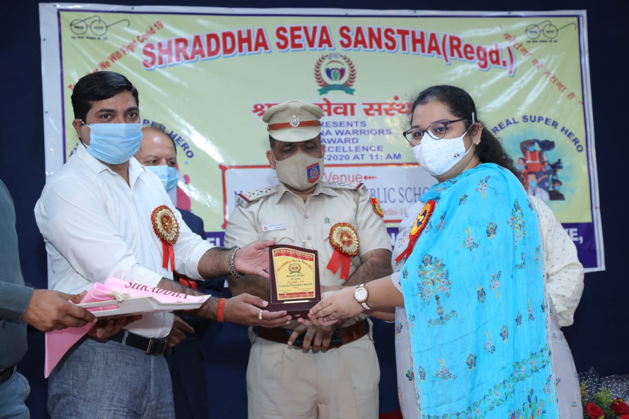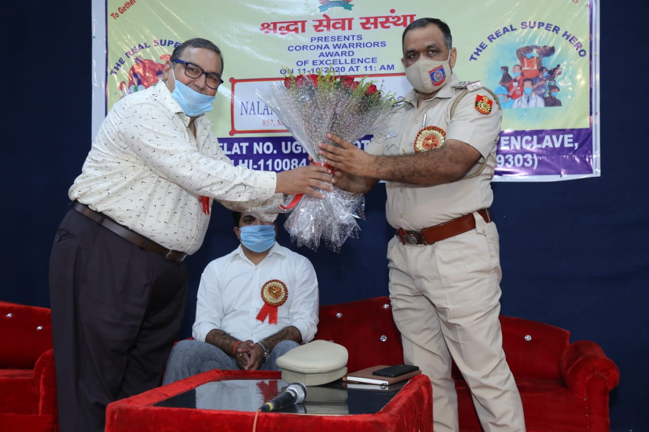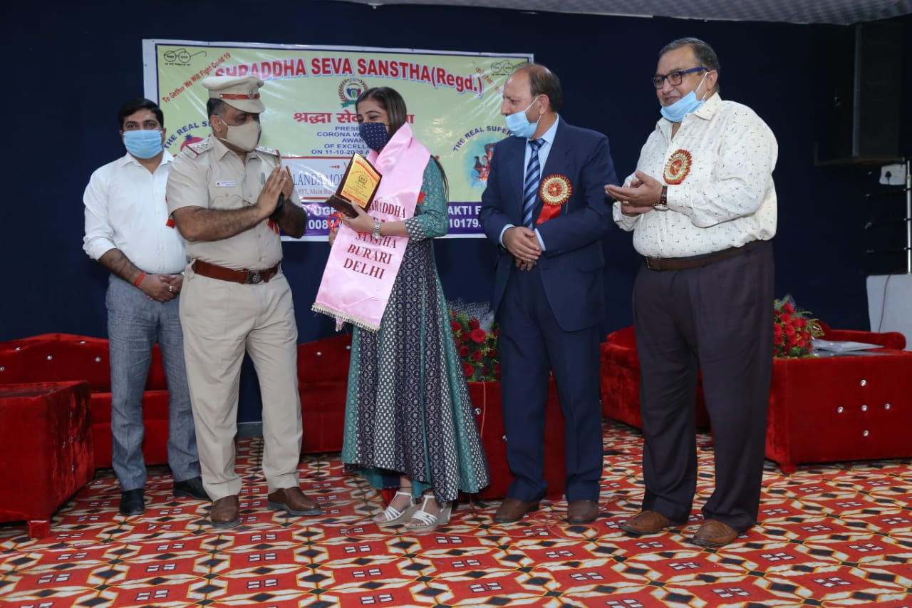 On dated 11th October 2020 (Sunday), In the auditorium of Nalanda Model Public School, Sant Nagar (Burari) 50 Corona Warriors were honoured by SHO Burari Sh. Suresh Kumar, Dr. Abdul Rehman Khadim Principal Green Valley College of Education, Sri Nagar (J&K) and Sh. Vikas Vats from the Parental School. Founder of Shraddha, Smt. Veena Chopra and Chairman Sh. Satya Prakash Bhardwaj Presided the function and welcome the Chief Guest. On this occasion Miss Komal Joshi, Sh. Rajveer Yadav, Sh. Rajeet Singh and Volunteers were present. On this auspicious occasion Sh. Suresh Kumar gave his blessings to Corona Warriors who are at the front-line of COVID-19 response. Together we will fight COVID-19 “As we contribute in our own way through social distancing and observing personal hygiene, let us salute our Corona Warriors” said by Dr. Abdul Rehman Khadim. Founder of Shraddha Smt. Veena Chopra gave vote of thanks. All Corona Warriors were honoured by angavastram, Shield, Medal along with some refreshment.